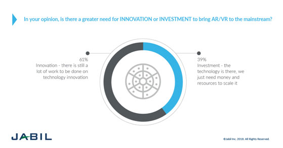 Ultimately, AR/VR requires technology to produce the content and devices to provide the experience. To identify innovation gaps, Jabil asked respondents committed to an AR/VR plan or pilot about the progress of content creation. Nearly three-fourths (74 percent) say that the technology that’s needed to create the content isn’t mature enough. There’s also the matter of cost. Nearly half (45 percent) say that it’s still too expensive to create content.