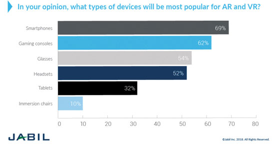 In addition to applications and use cases, survey respondents were asked to predict which types of devices would have the widest use. Smartphones (69 percent), gaming consoles (62 percent) and smart-glasses (54 percent) led the way. Respondents also predicted a significant role for headsets (52 percent) and tablets (32 percent) but seemed skeptical that immersion chairs (10 percent) would find widespread adoption.